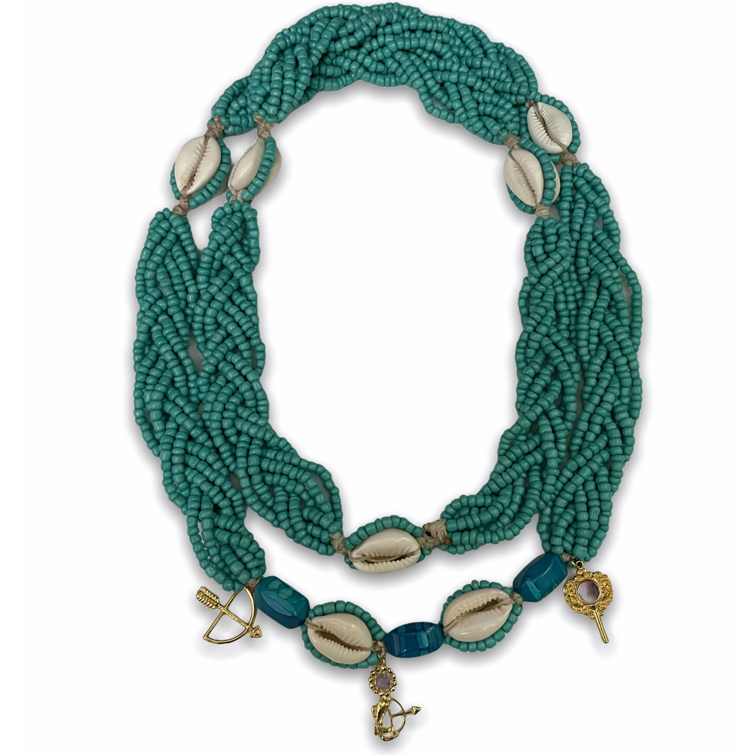 Brajá 7 Fios Trançado - Azul Turquesa C\ 14 Búzios e Pingente (Logun Ede)
