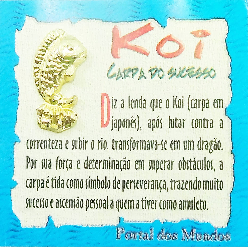 Diz a lenda que o Koi (carpa em japonês), após lutar contra a correnteza e subir o rio. Transforma-se em um dragão. Por sua força e determinação em superar obstáculos, a carpa é tida como símbolo de perseverança , trazendo muito sucesso e ascensão pessoal a quem a tiver como amuleto. Dando-o de presente você estará oferecendo a força da superação à pessoa presenteada e recebendo tudo de volta pela lei do retorno.