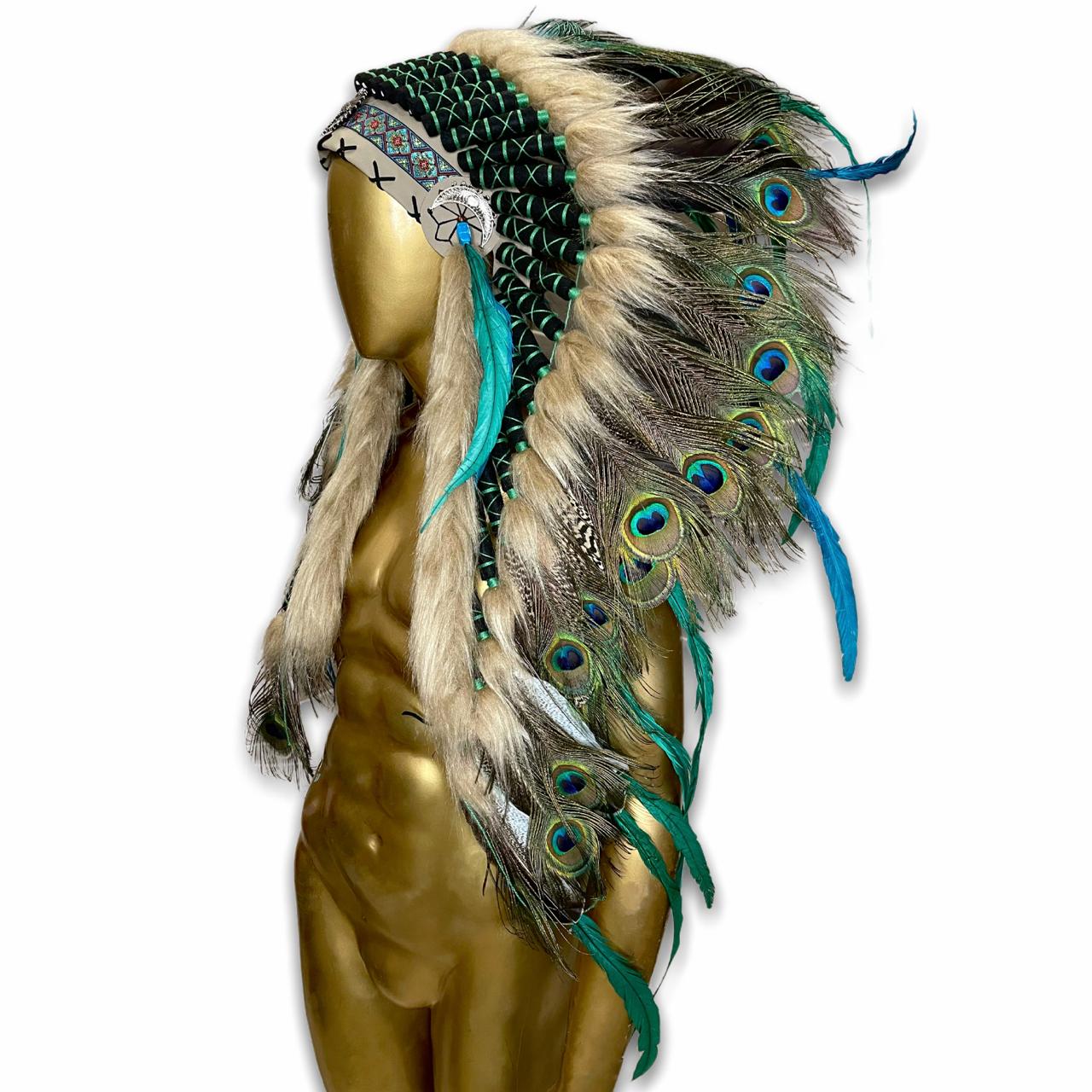 Penacho Índio Americano Grande - Penacho Natural Com Pena De Pavão