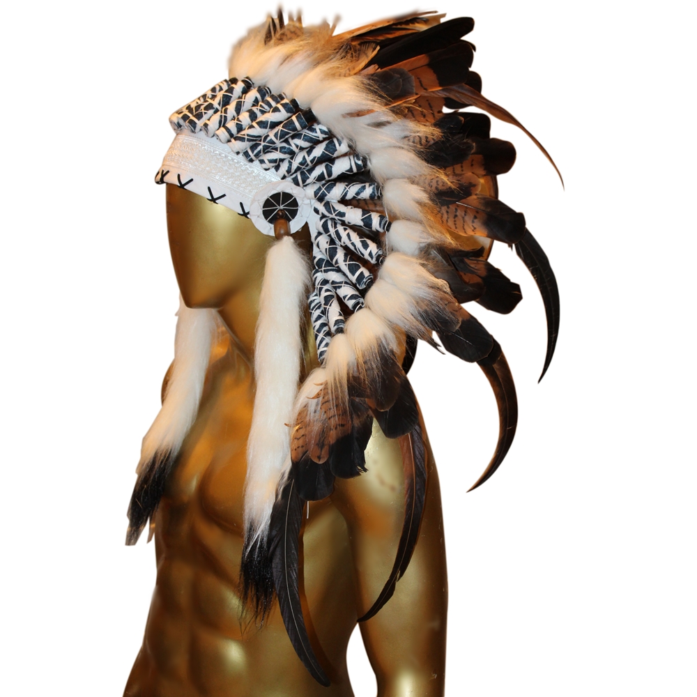 Penacho Índio Americano Pequeno - Pena de Galo e Faisão Vermelho com Preto