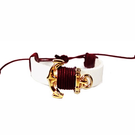 Feita em couro vegetal branco de alta qualidade, pingente em formato de âncora com banho de ouro e para finalizar possui detalhes em algodão encerado na cor vinho.
